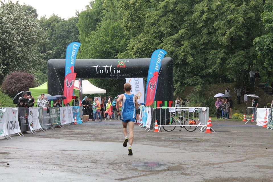 Czułem się tego dnia wyjątkowo dobrze i wiedziałem, że ten bieg toczy się tak jak go sobie zaplanowałem. Na mniej więcej 1,5 km przed metą zaczął dosyć mocno padać deszcz. Nie kontrolowałem czasu, gdyż cały czas patrzyłem żeby gdzieś się nie potknąć. Jednocześnie starałem się gonić rywali. Dawid był nie do złapania ale do Michała odległość zmniejszała się więc na ok. kilometr przed metą postanowiłem zaatakować. Ruszyłem mocniej i na dystansie ok. 200-300 m doszedłem go i wyprzedziłem. Wiedziałem, że jestem piąty, a dodatkowo trzeci zarówno w klasyfikacji lublinian, jak i studentów. Deszcz padał co raz mocniej, ale nie zwracałem na to uwagi. Do mety zostało jakieś 400m i bardzo stromy podbieg. Słyszałem jak Michał, którego wyprzedziłem krzyczał za mną żebym biegł mocno i gonił Dawida. Na szczycie ostatniego podbiegu krzyknął mi jeszcze Karol Flejmer, że jestem piąty i tak w strugach deszczu wpadłem uszczęśliwiony na metę 11 sekund za Dawidem. Czas netto 17:16 okazał się moją nową życiówką, co świadczy o tym, że na płaskiej trasie jestem w tej chwili w stanie pobiec poniżej 17 minut. Na mecie byłem tak zmęczony, że musiałem na chwilę położyć się na trawie. Pozostało już tylko coś zjeść i czekać na dekoracje. Tradycyjny telefon do trenera i wymiana opinii ze znajomymi biegaczami.