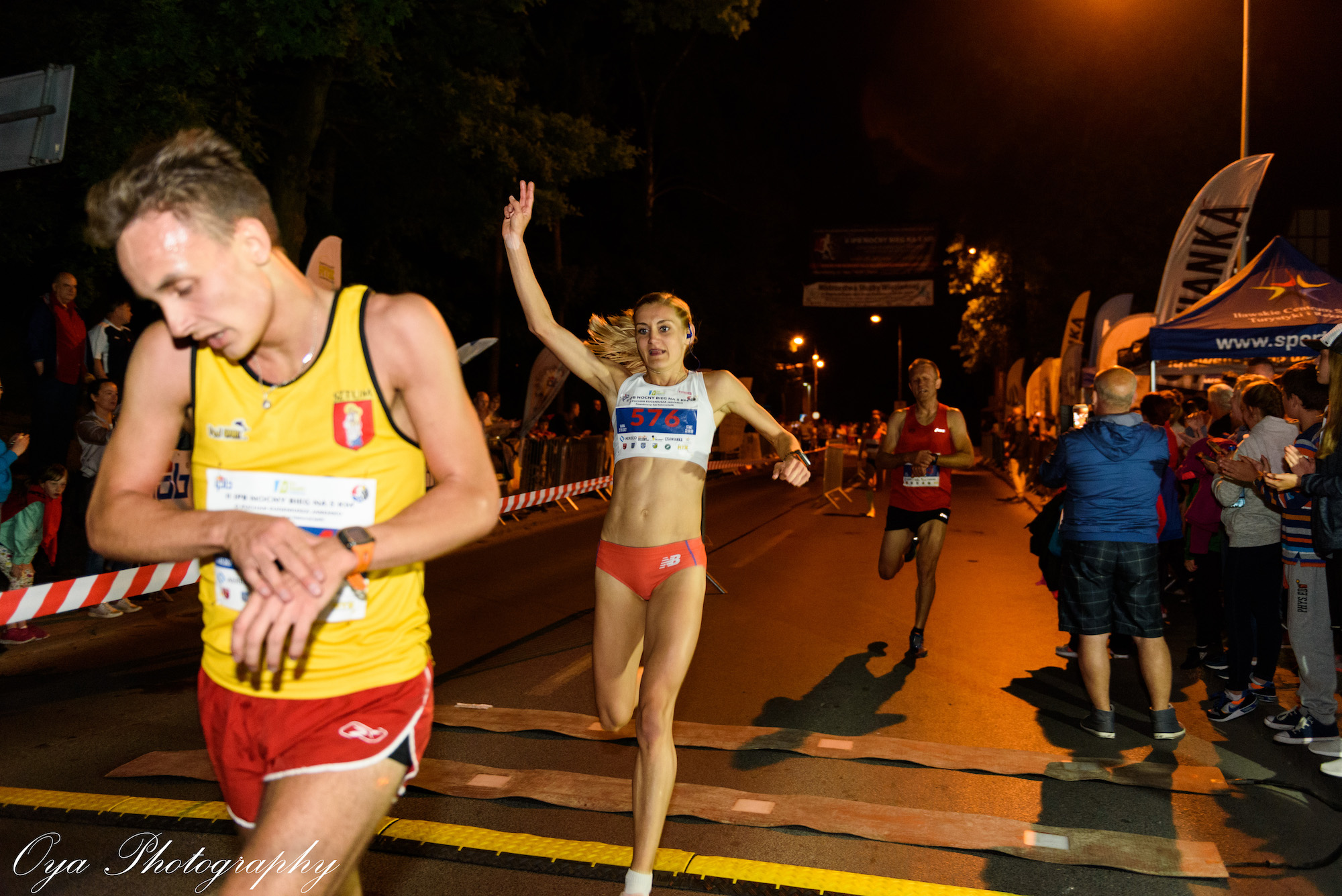 Punktualnie o 22:00 biegacze ruszyli na trasę. W tym roku pierwszy dobiegł Ukrainiec Sergii Okseniuk (14:28). Wydaje mi się, że nie muszę przybliżać sylwetki tego zawodnika. Drugie miejsce po zaciętej walce wywalczył Damian Roszko (14:30), a trzecie Dawid Malina (14:31). Jako ciekawostkę dodam, że czwarty zawodnik – Mateusz Demczyszak nabiegał taki sam czas jak trzeci (14:31), a piąty Bartosz Kotłowski wybiegał 14:32. To był sprinterski finisz! Osiemnastu zawodników uporało się z barierą 16 minut.